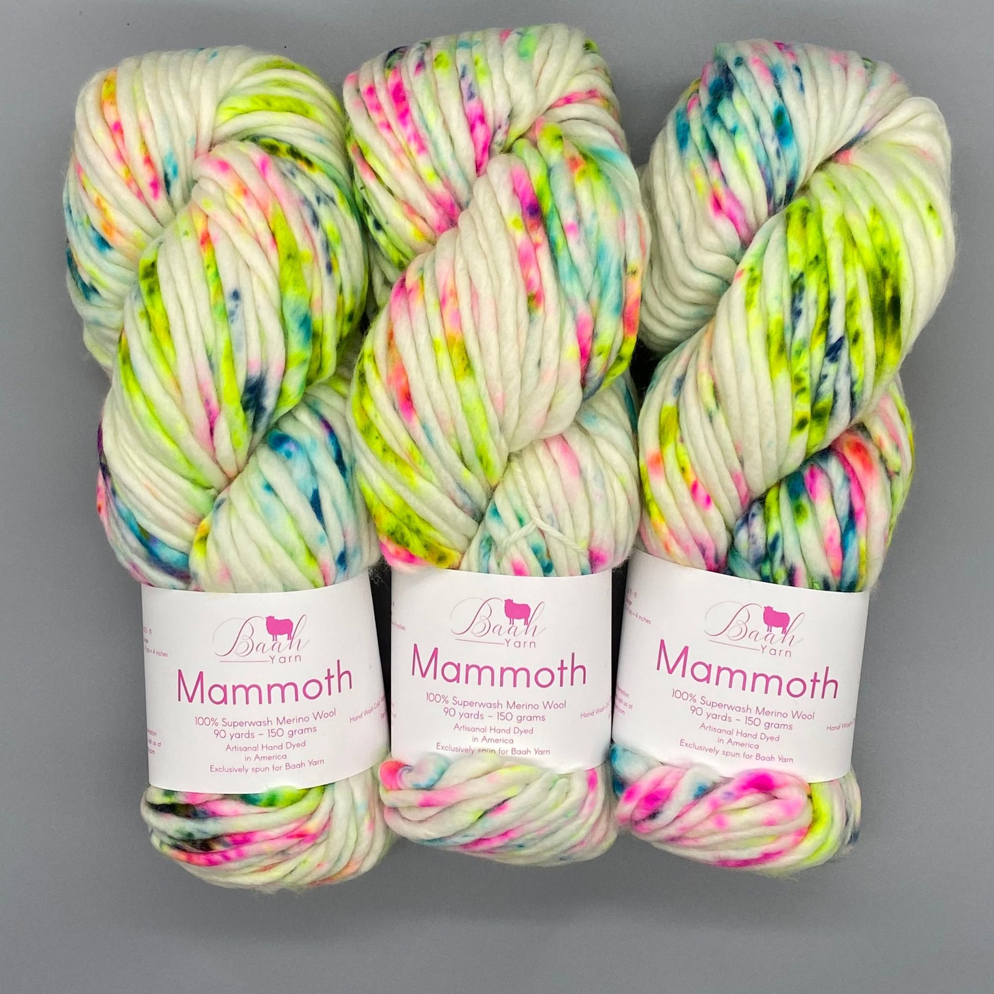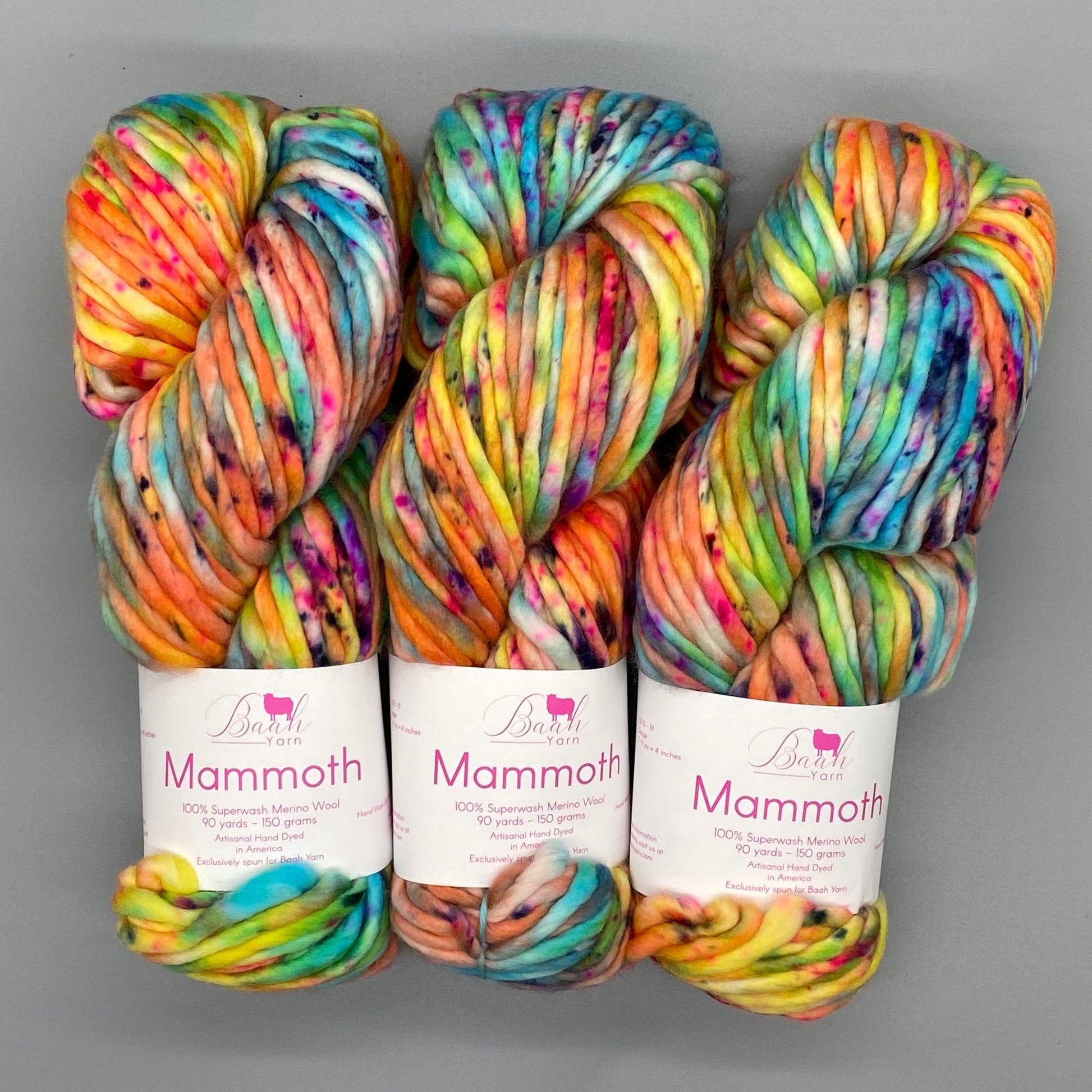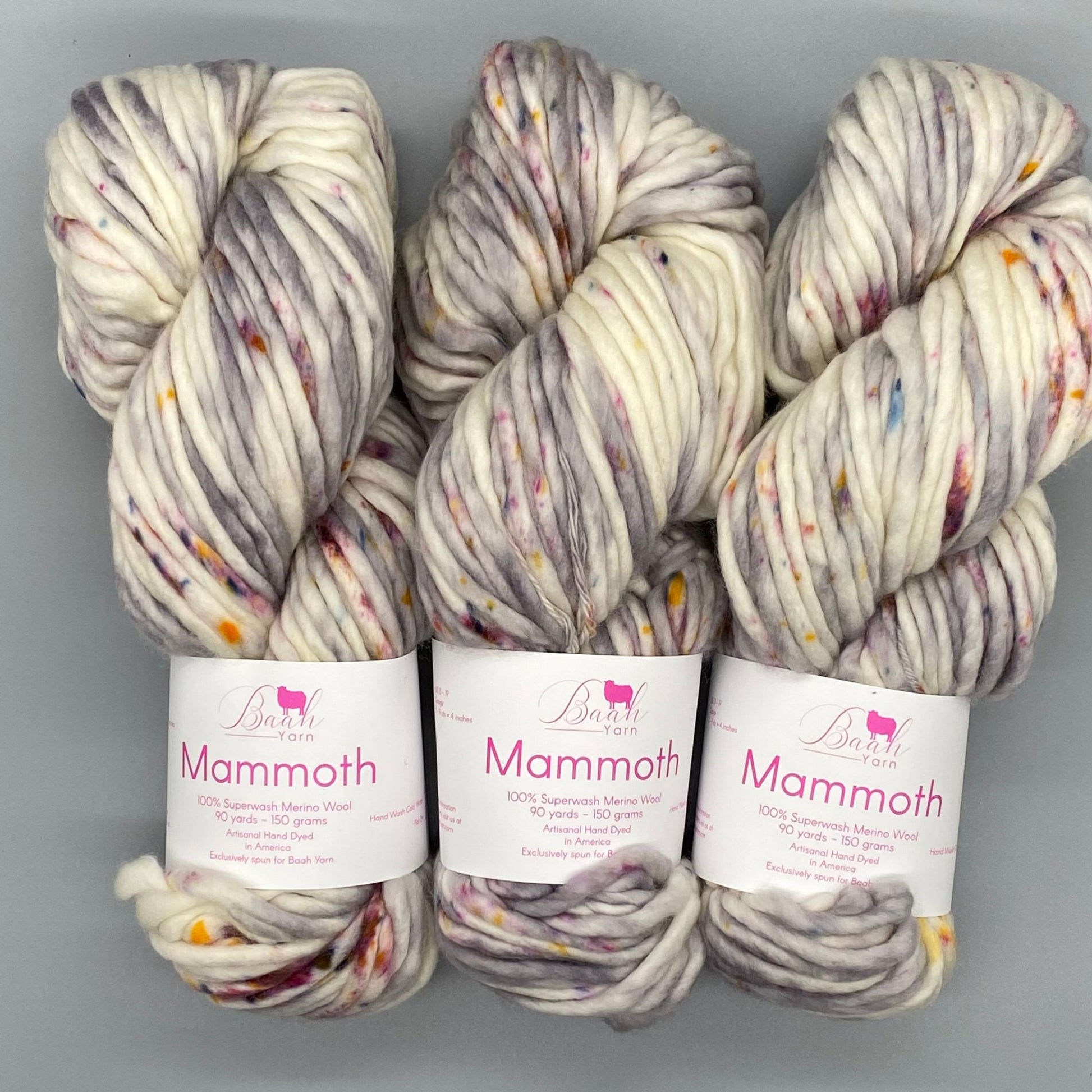 Introducing Baah Mammouth - the ultimate statement accessory for quick projects. Made with luxurious, 100% superwash merino wool, this super bulky yarn is soft, buttery, and offers vibrant colors for self expression. Its single ply canvas allows for easy and quick knitting, making it perfect for on-the-go projects. Elevate your crafting with Baah Mammouth.