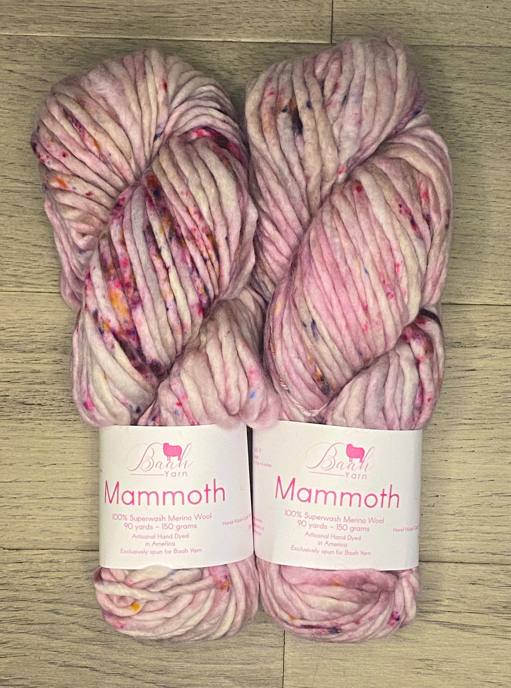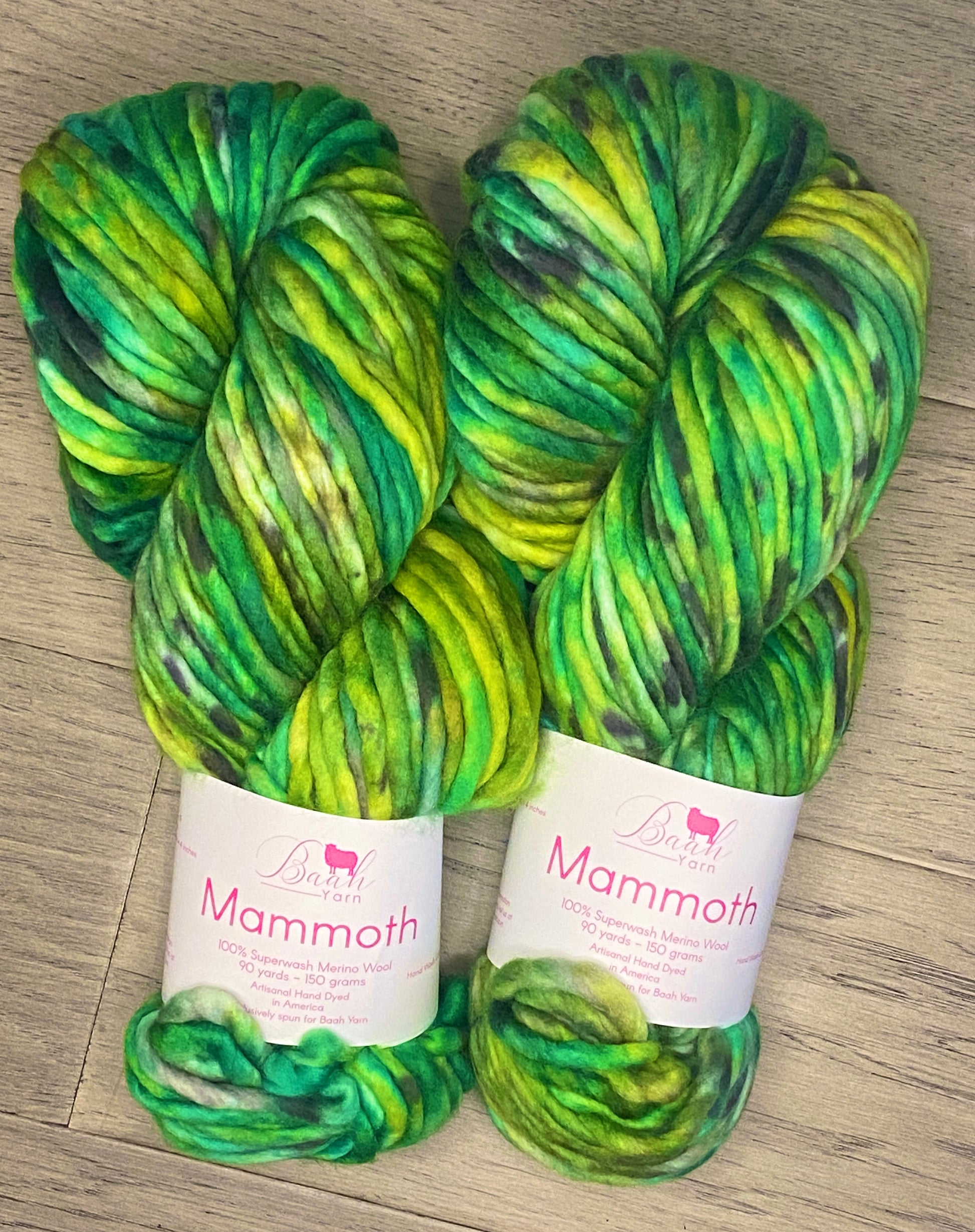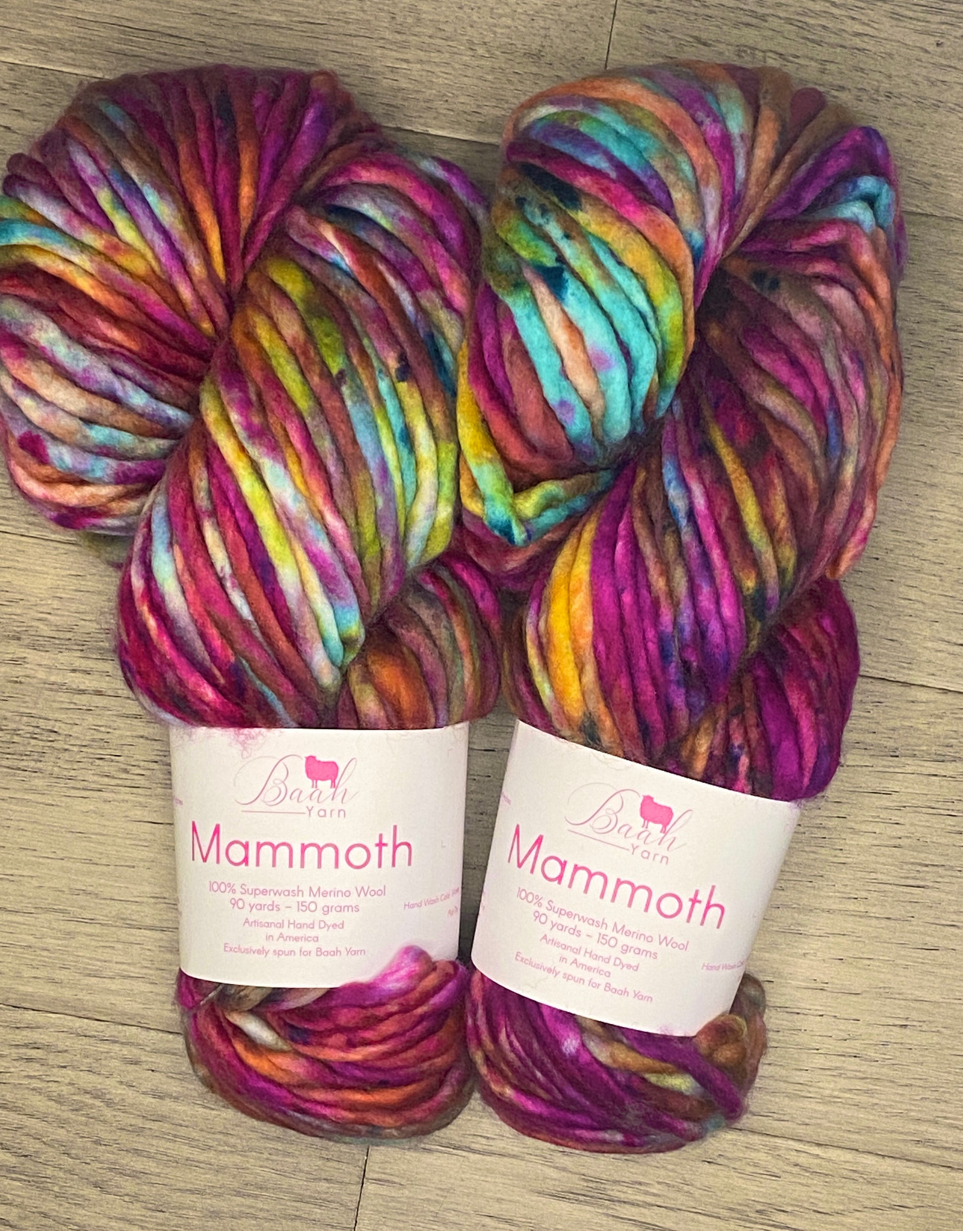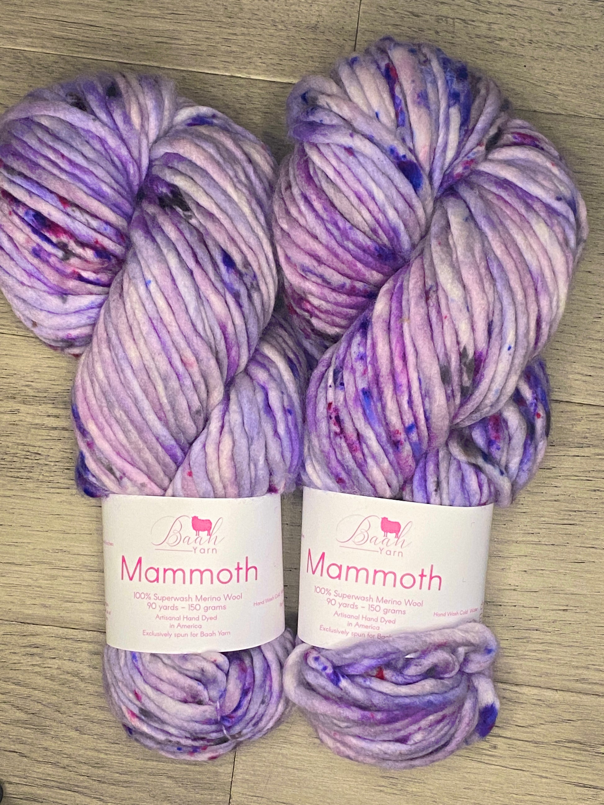Introducing Baah Mammouth - the ultimate statement accessory for quick projects. Made with luxurious, 100% superwash merino wool, this super bulky yarn is soft, buttery, and offers vibrant colors for self expression. Its single ply canvas allows for easy and quick knitting, making it perfect for on-the-go projects. Elevate your crafting with Baah Mammouth.
