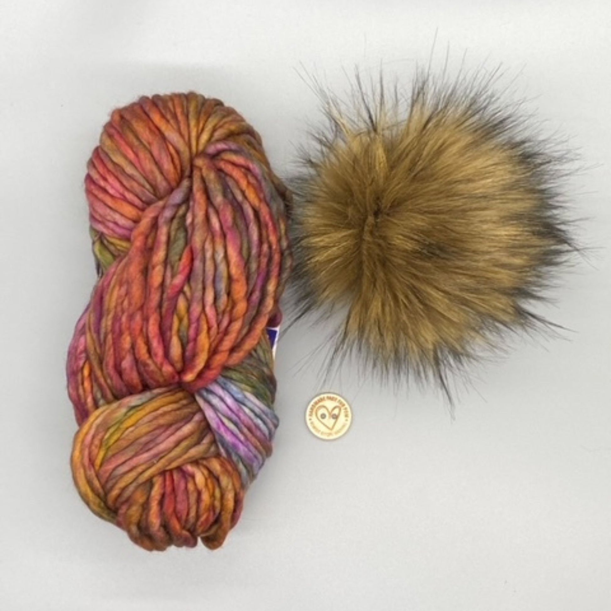 Malabrigo RASTA in colour Pedras with brown fox faux fur pompom and button